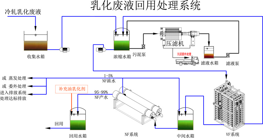 威迪使用自主研發的TMF管式微濾膜系統+納濾系統處理技術,克服了傳統乳化廢液處理工藝的缺點,為客戶提供高效、可靠地乳化廢液解決方案。