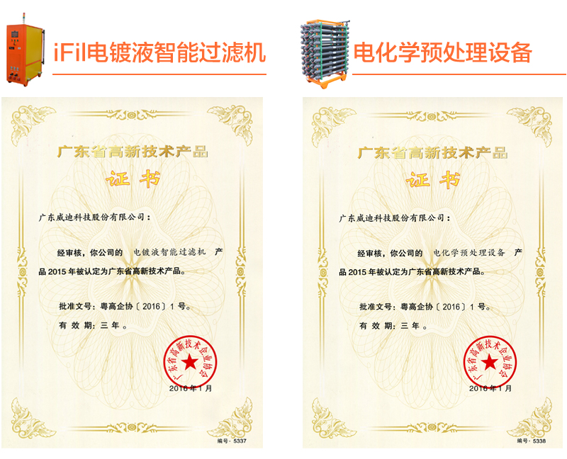 2016年1月,威迪創新產品電鍍液智能過濾機、電化學預處理設備同時獲得了東高新技術產品認定證書。高新技術產品認定條件首先需要的是知識產權歸屬明晰、技術成熟、市場潛力大,有較好的經濟效益、社會效益和環境效益,符合可持續發展的要求,生產過程應符合國家產業政策、安全和環境保護的要求。