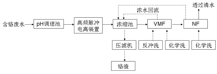 對于含鉻重金屬廢水,經過調節pH后加入少量藥劑進行破絡合,然后廢水進入連續高頻脈沖電離系統,經過處理后的水調節pH直接進入VMF,然后經NF處理之后的產水中鉻含量可達到0.5mg/L以下,可達標排放至污水處理中心進一步生化處理或者直接進RO系統進行回用處理,以滿足企業60%回用的要求;污泥被壓渣后交具資質的公司處理。系統中電離采用鐵陰極、炭纖維陽極,電離反應器中填充金屬泡沫,反應時間30min;VMF帶自動反沖洗系統,每運行約20-30分鐘自動反沖洗15s左右,當TMF膜的通量衰減到300L/m2h則自動進行化學清洗,根據運行效果,大約每15天進行化學清洗一次。當NF污染到一定程度,則自動進行化學清洗,運行中大約2-6月需化學清洗一次。