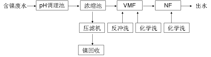 對于含酸鎳重金屬廢水,首先將廢水調節至pH 11~11.5,然后直接進入VMF膜分離,以切向流過濾的形式其VMF濃水回流至濃縮池,而濃縮池內水連接壓濾機,將其中的鎳沉淀物直接壓成鎳渣進行回收;而VMF透過液則進入NF裝置,進一步過濾其中的鎳離子,可達標排放至污水處理中心進一步生化處理;也可以直接回用普通的清洗或配套RO生產純水,以滿足企業60%回用的要求。鎳金屬可直接壓渣后加硫酸溶解后(硫酸鎳)回用或交具資質的公司處理。TMF與NF組合工藝中TMF帶自動反沖洗系統,每運行約20分鐘自動反沖洗10s左右,當TMF膜的能量衰減到300L/m2h則自動進行化學清洗,根據運行效果,大約每15-20d進行化學清洗一次。當NF污染到一定程度,則自動進行化學清洗,運行中大約2月需化學清洗一次。