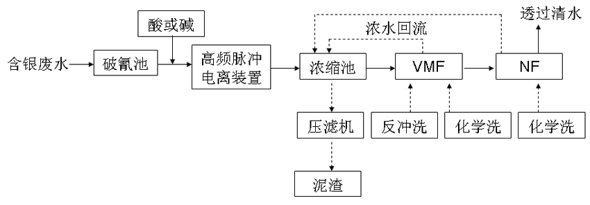 含銀廢水, 經過調整pH后加入少量藥劑進行破氰,再調節pH進入連續高頻脈沖電離系統,經過處理后的水調節pH直接進入TMF(固液分離膜系統),產水即可達標排放至污水處理中心,也可以直接回用普通的清洗或配套RO生產純水,以滿足企業60%回用的要求。污泥被壓渣后交具資質的公司處理。系統中電離采用鐵陰極、炭纖維陽極,電離反應器中填充金屬泡沫,反應時間30min;VMF帶自動反沖洗系統,每運行約20-30分鐘自動反沖洗15s左右,當TMF膜的通量衰減到300L/m2h則自動進行化學清洗,根據運行效果,大約每15天進行化學清洗一次。當NF污染到一定程度,則自動進行化學清洗,運行中大約2-6月需化學清洗一次。