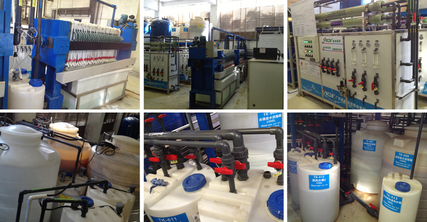 綜合廢水首先進(jìn)行水質(zhì)調(diào)理,然后進(jìn)行電離處理,進(jìn)一步再經(jīng)TMF管式膜處理后經(jīng)二級(jí)RO處理,保證公司總廢水量60%回用。濃水則進(jìn)入公司另建的生化處理系統(tǒng),保證處理后排水達(dá)到(GB21900-2008)表3標(biāo)準(zhǔn)的要求。在⑨、⑩、⑾、⑿、⒀五個(gè)點(diǎn)位取樣監(jiān)測(cè)水質(zhì),其中:⑨ ⑩可測(cè)電離綜合廢水除污量;⑩ ⑾可測(cè)反應(yīng)水箱、濃縮水箱除污量;⑾ ⑿可測(cè)TMF系統(tǒng)除污量;⑿ ⒀可測(cè)RO工藝除污量。