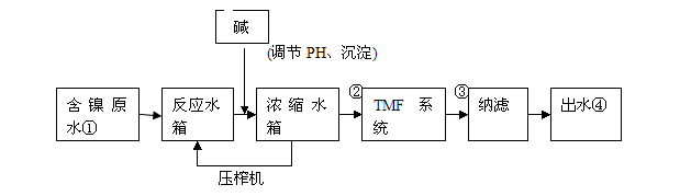 采用TMF與NF組合工藝,TMF帶自動(dòng)反沖洗系統(tǒng),每運(yùn)行約20分鐘自動(dòng)反沖洗10s左右,當(dāng)TMF膜的能量衰減到300L/m2h則自動(dòng)進(jìn)行化學(xué)清洗,根據(jù)運(yùn)行效果,大約每15-20d進(jìn)行化學(xué)清洗一次。當(dāng)NF污染到一定程度,則手動(dòng)進(jìn)行化學(xué)清洗,運(yùn)行中大約2月需化學(xué)清洗一次。經(jīng)過(guò)處理后的水質(zhì)需達(dá)到Ni濃度小于0.1mg/L,處理后廢水進(jìn)入公司另建的生化處理系統(tǒng),保證處理后排水達(dá)到(GB21900-2008)表3標(biāo)準(zhǔn)的要求。在①②③④四個(gè)點(diǎn)位取樣監(jiān)測(cè)水質(zhì),其中:②可測(cè)反應(yīng)水箱、濃縮水箱除去鎳的量;③可測(cè)TMF系統(tǒng)除鎳量;④可測(cè)納濾工藝除鎳量。