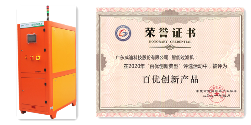 威迪股份專利產品“智能過濾機”在東莞市高新技術產業協會2020年“百優創新典型”評選活動中,被評為“百優創新產品”。